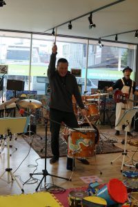 梶原さんのドラムのリズムに合わせ色々な打楽器と