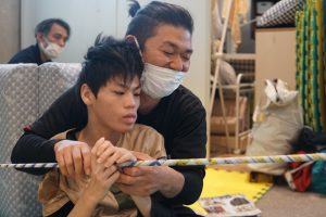 新聞紙を丸めて作ったアイテムで狙いを定めます🎯