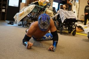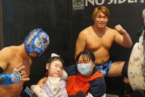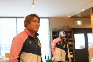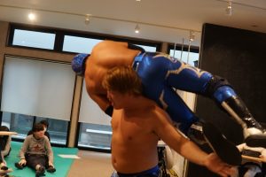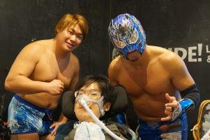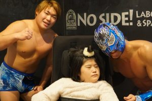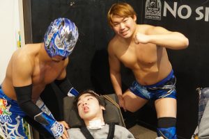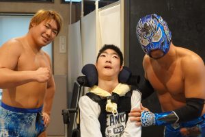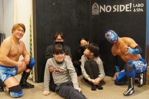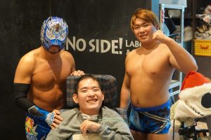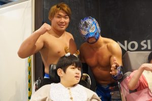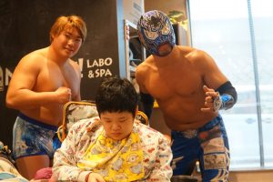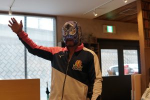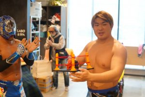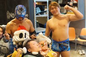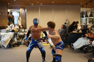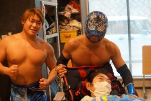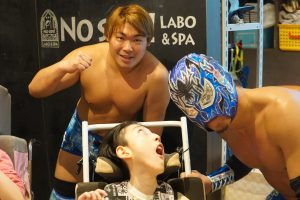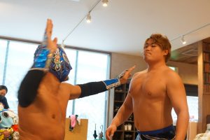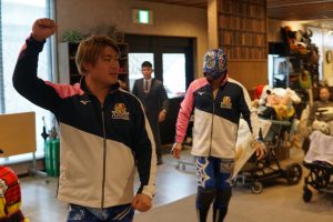 入口のドアが開いた瞬間、そこに立っていたのは…なんと大阪プロレスのレスラーのふたり💪💪