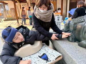 その後は「撫で牛」を撫でて健康と知恵を授かります。