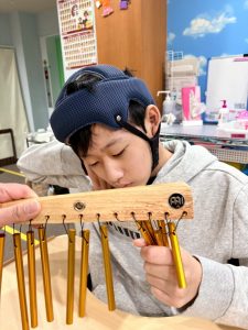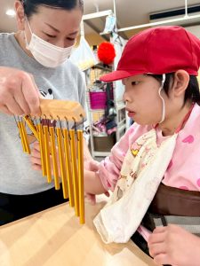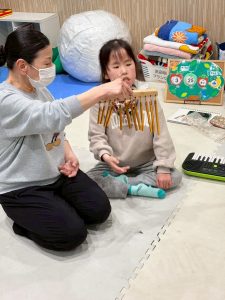 そーっと触るお友だち、大胆に鳴らすお友だち、みんなそれぞれの触り方でツリーチャイムを鳴らします。