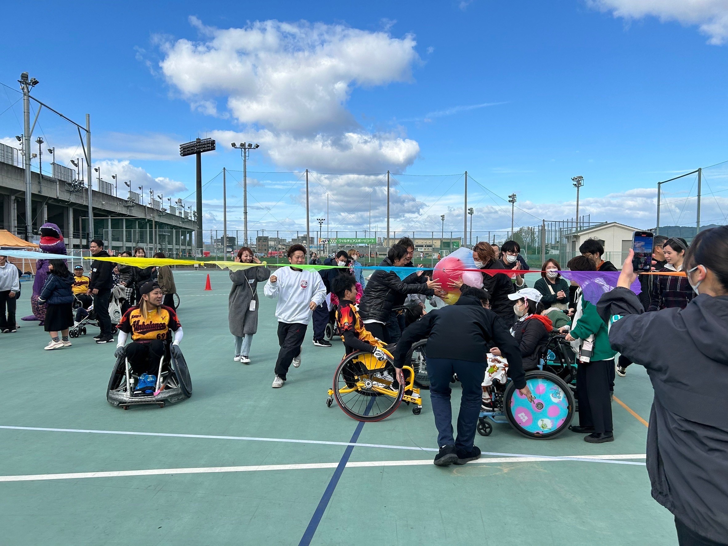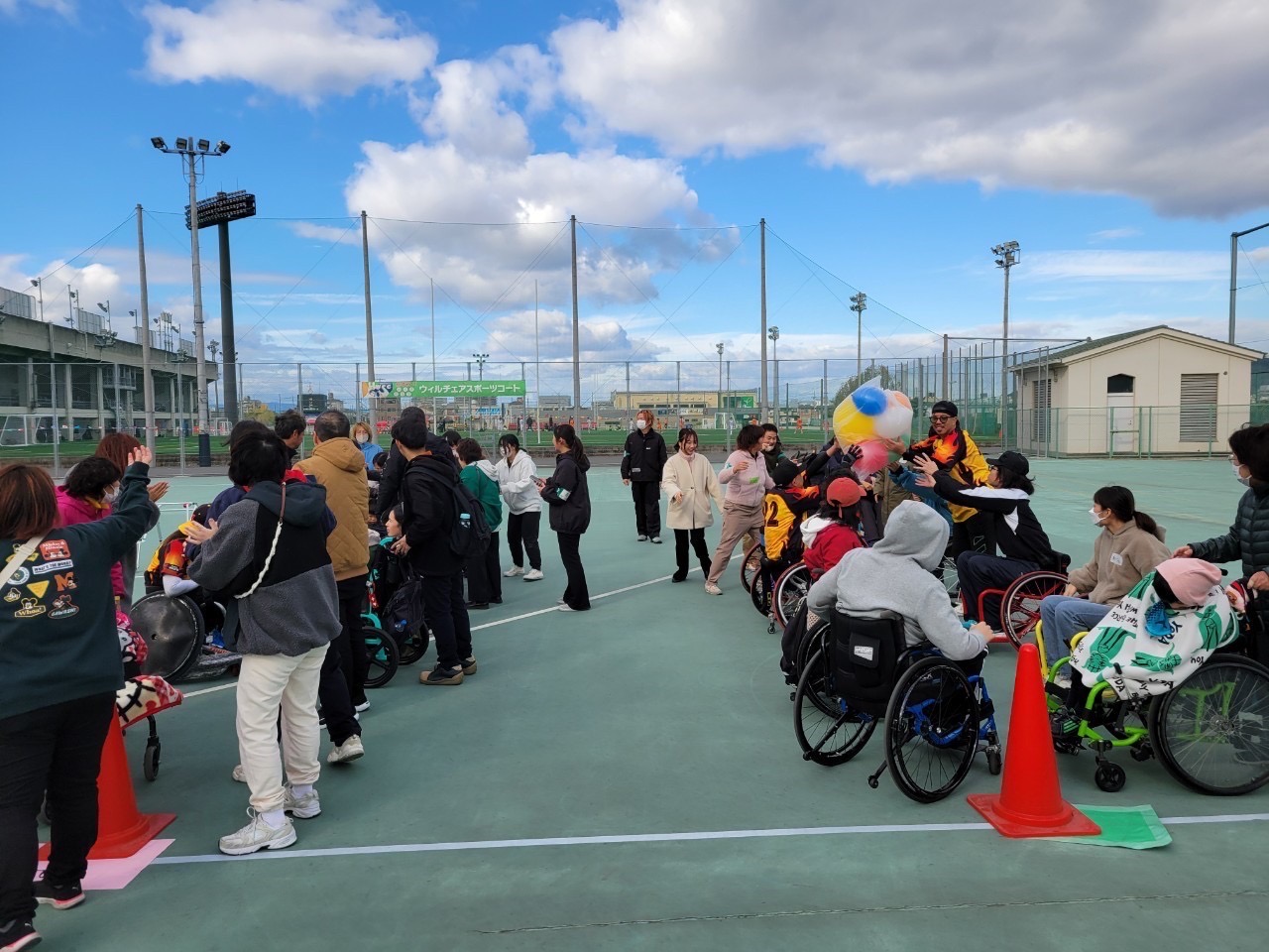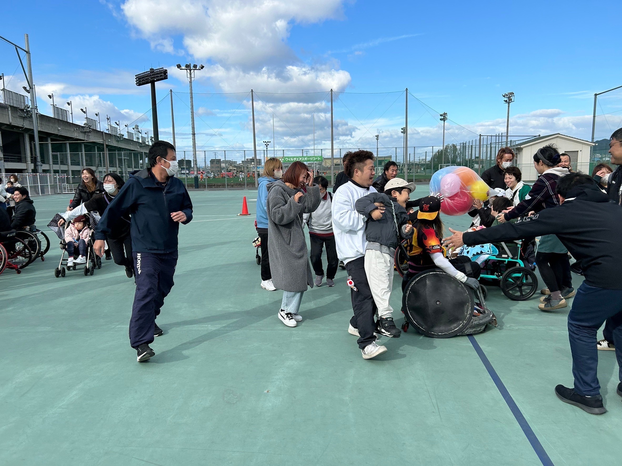大玉風船送りでは、車椅子に乗りご自身の頭の上に風船をセットし後ろの方に送っていきました