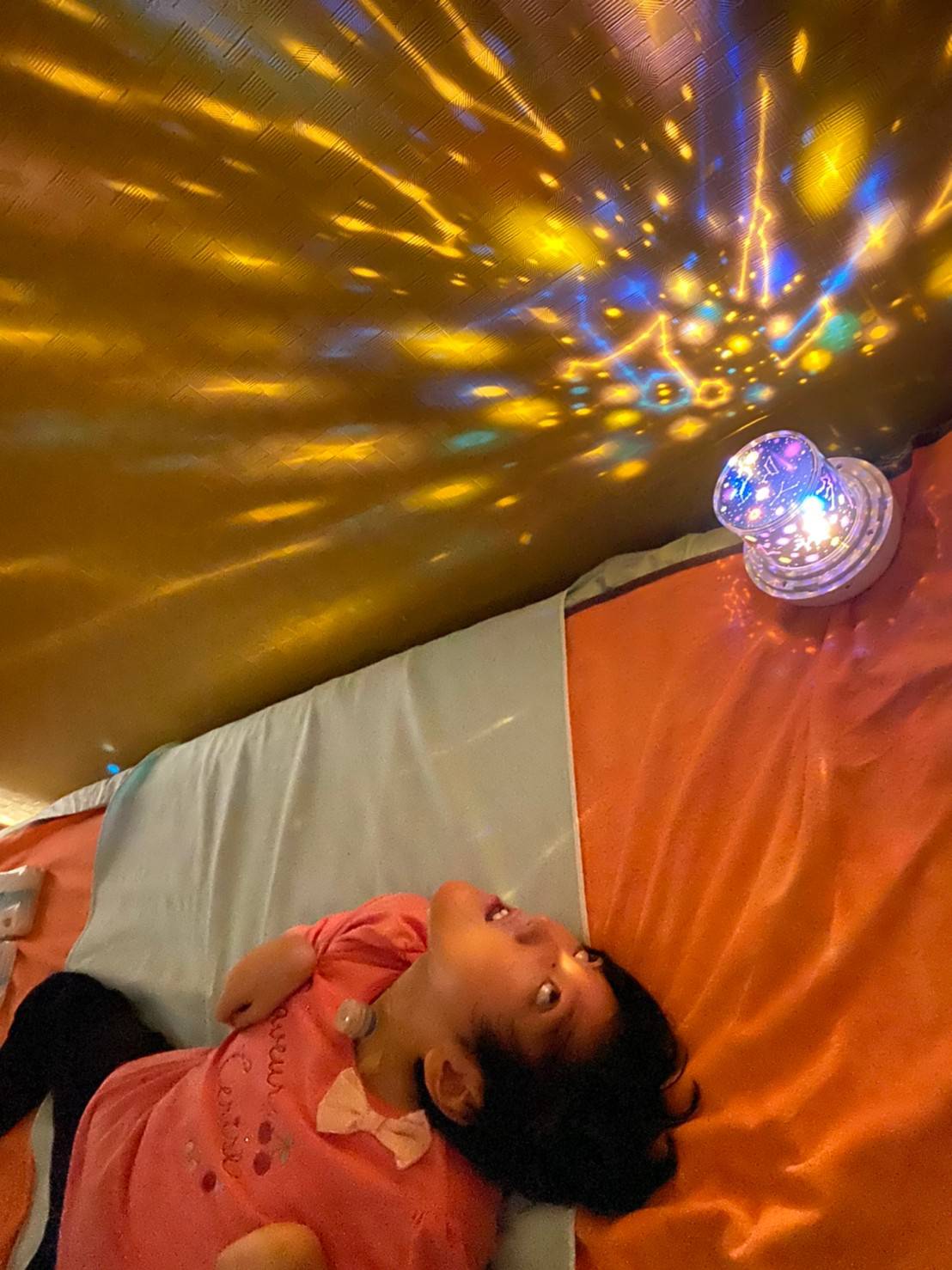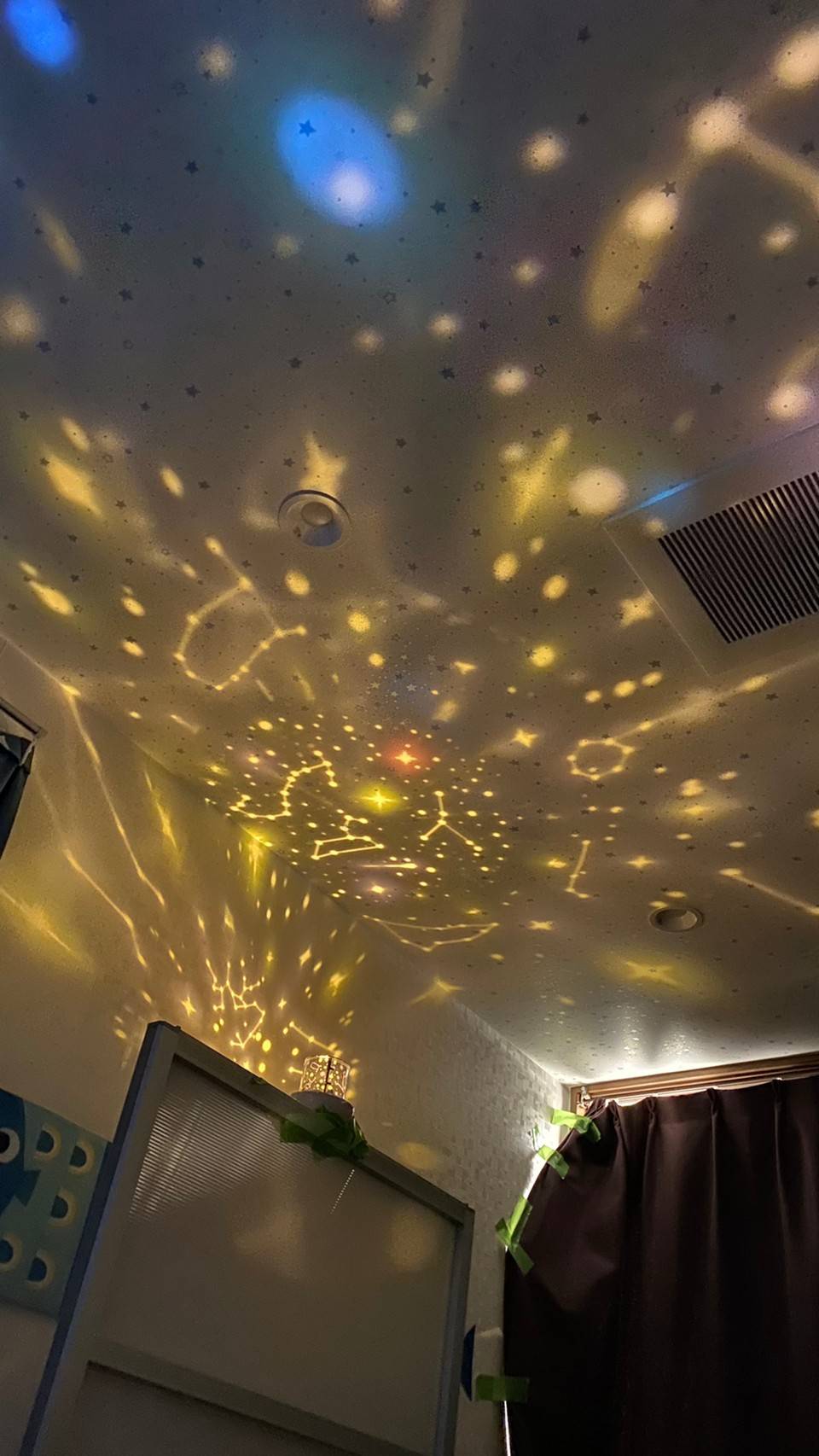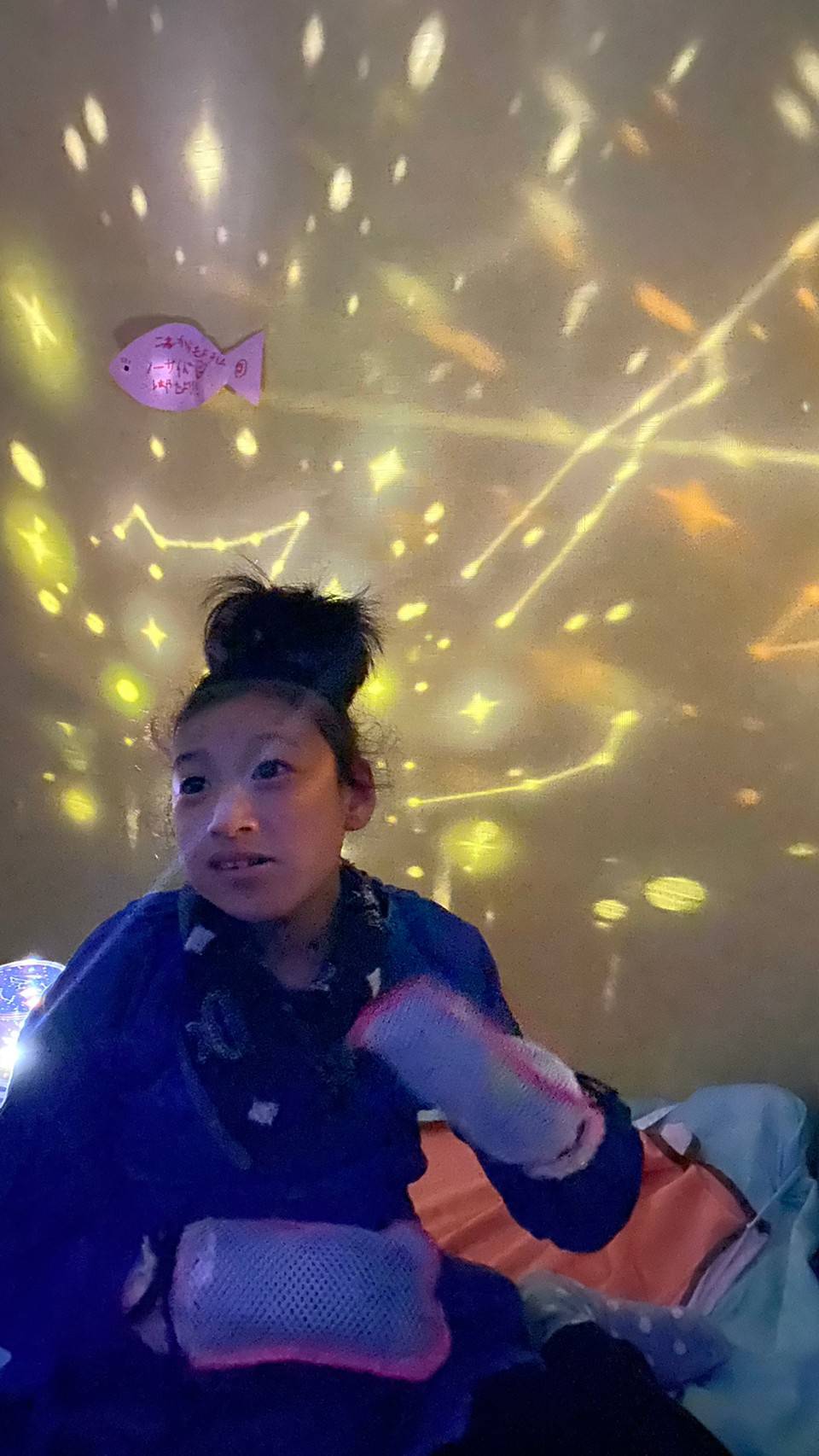 一つの部屋を暗くしてプラネタリウムの光を天井や壁に映し出し、色んな色に変わるキレイな星座を子どもたちと一緒に見ました(*^^*)
