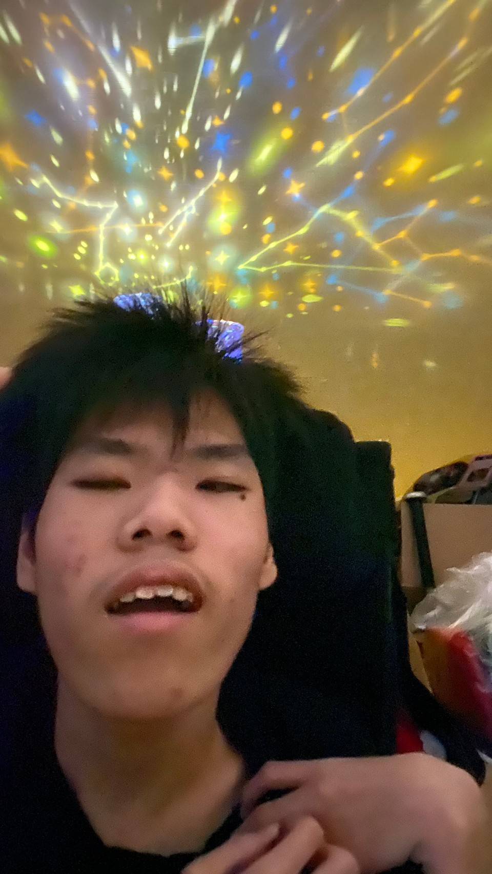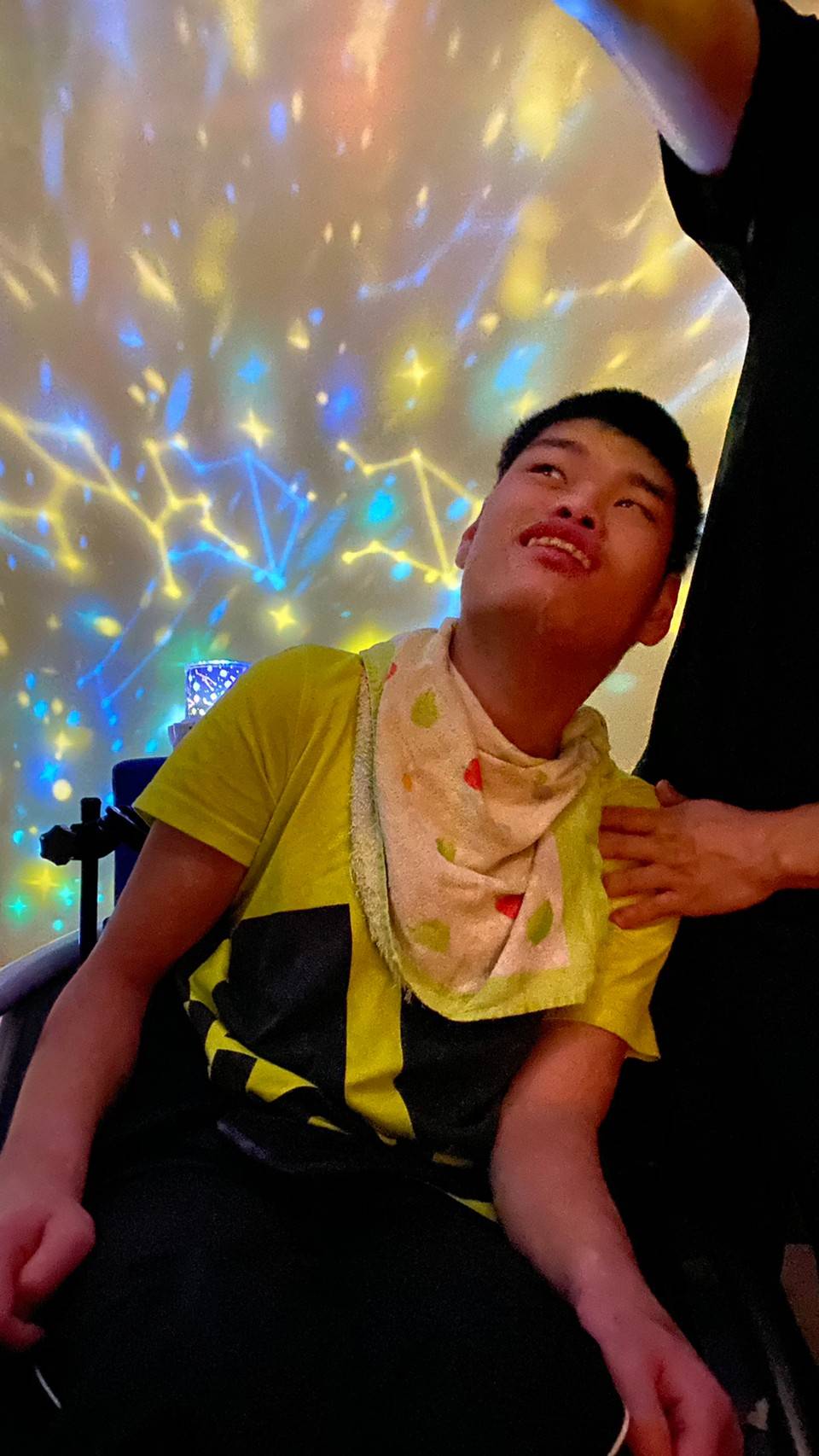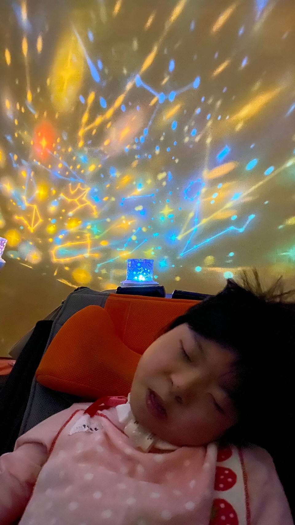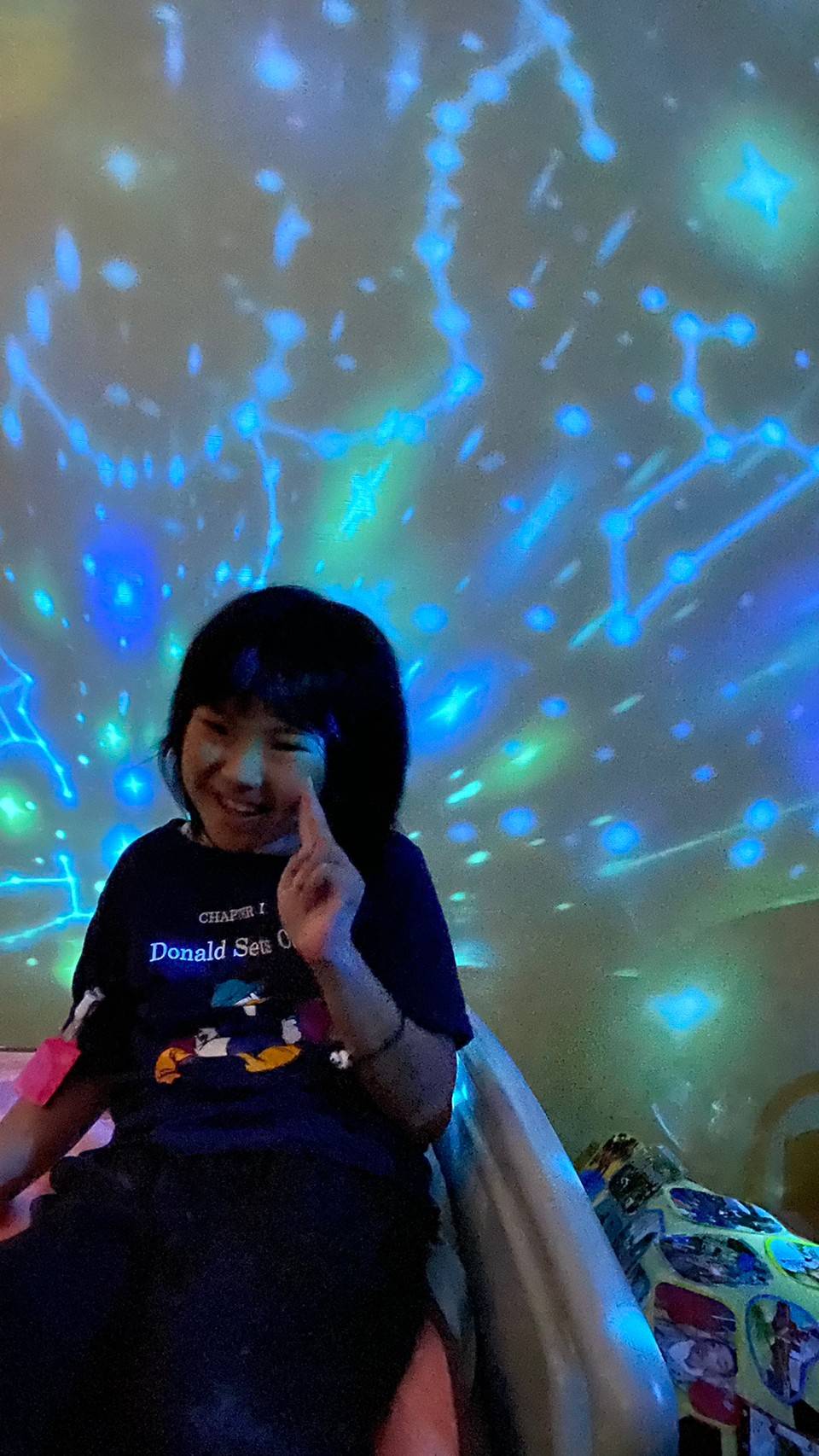 一つの部屋を暗くしてプラネタリウムの光を天井や壁に映し出し、色んな色に変わるキレイな星座を子どもたちと一緒に見ました(*^^*)