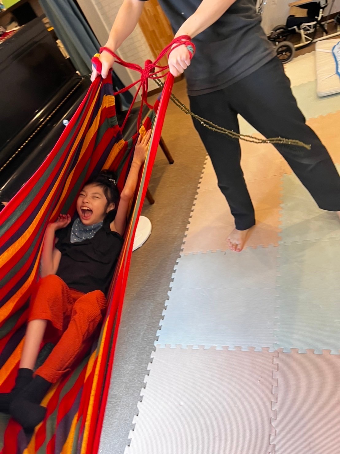 スタッフと一緒にトランポリンやシーツブランコをしてみたり、、、