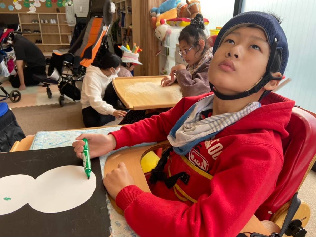 デイでは月毎に題材を決め、子どもたちそれぞれに作品を作ってもらって、玄関横のスペースに並べて飾る壁面制作を実施しています