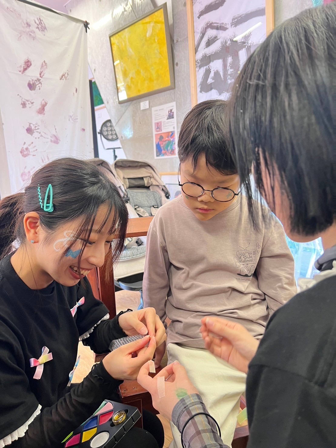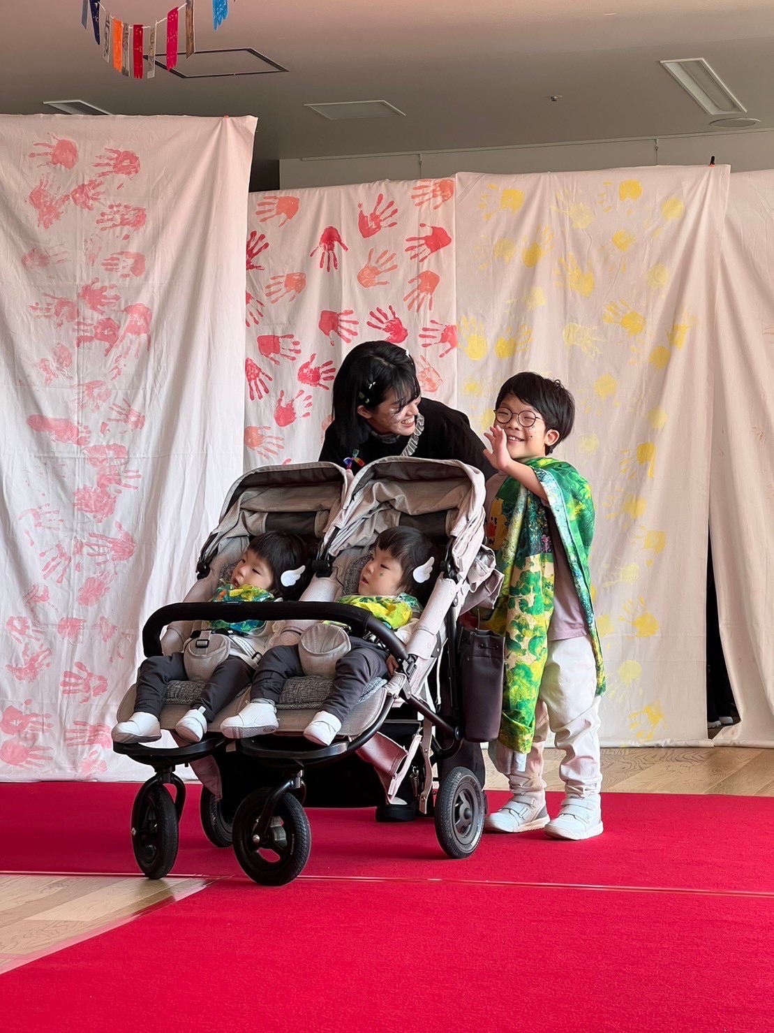 事前にそれぞれの施設で、子ども達・利用者さんで手形をとった布生地をバックにランウェイ💓