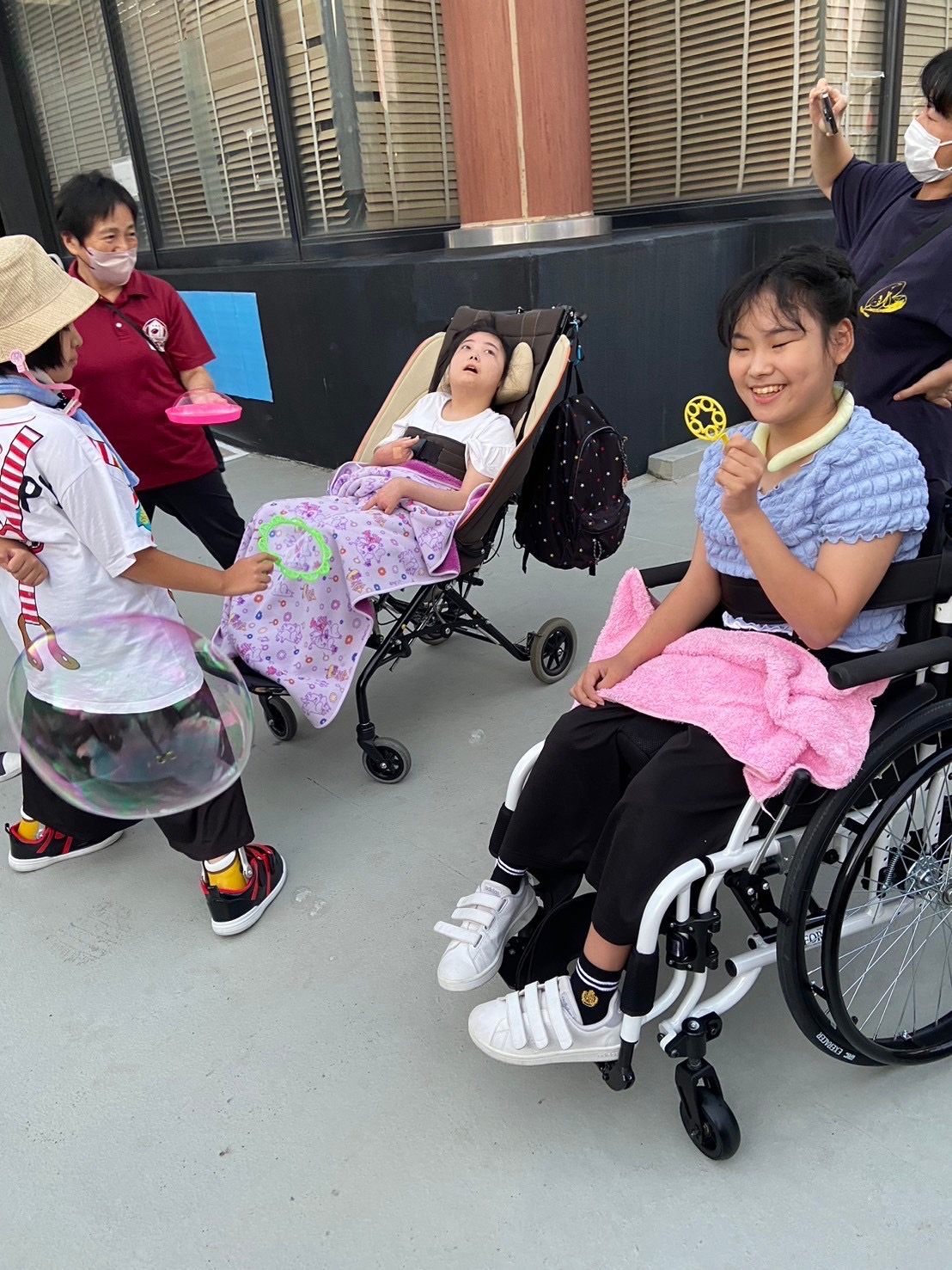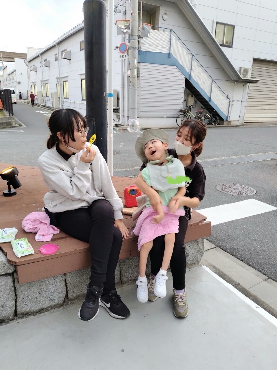 おやつの後には外に出て、シャボン玉を行いました!おっきなシャボン玉を作ったりしました