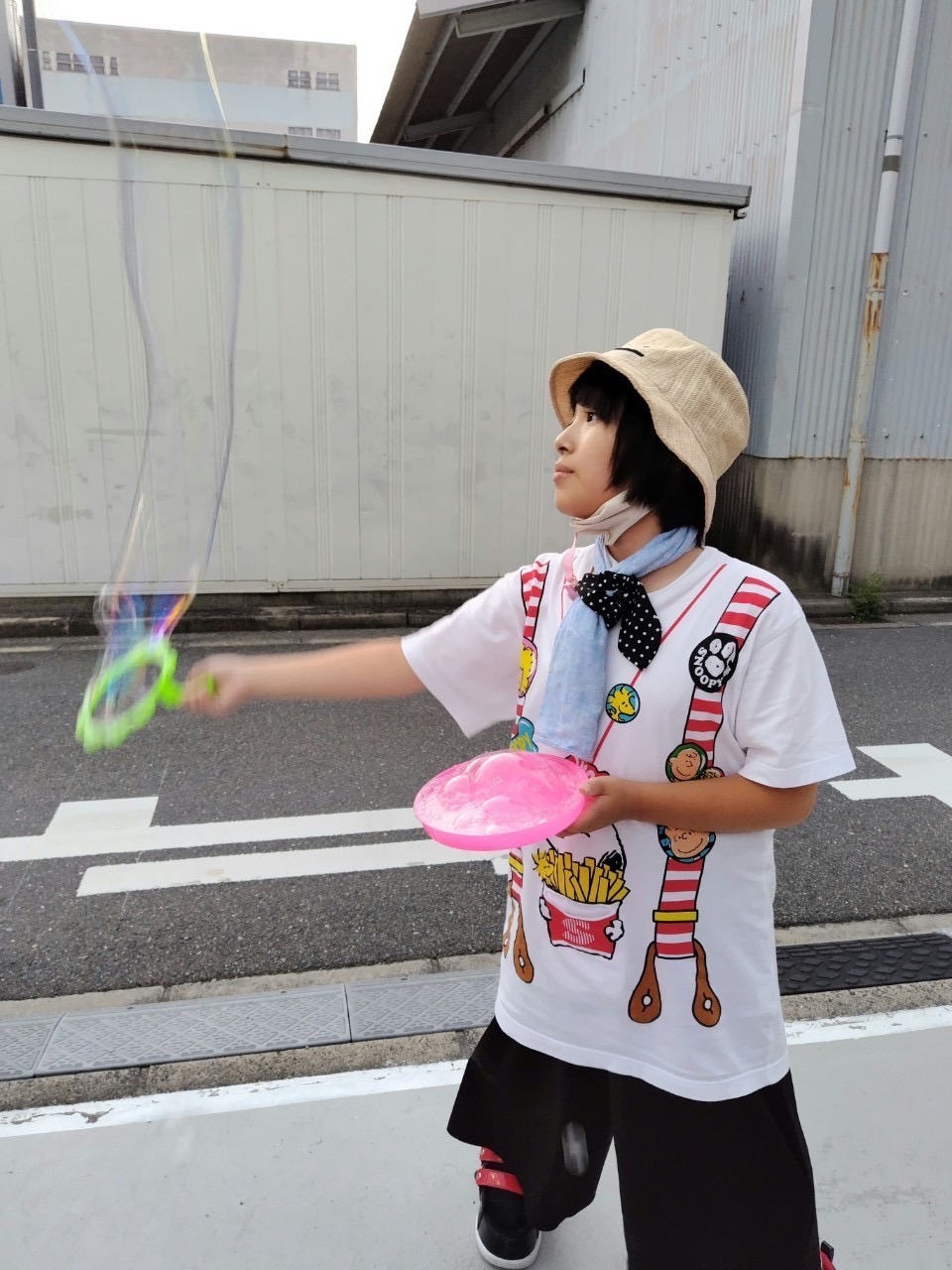 おやつの後には外に出て、シャボン玉を行いました!おっきなシャボン玉を作ったりしました