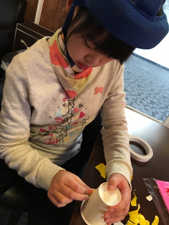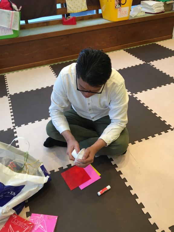 折り紙をまいたり、ちぎって貼ったり