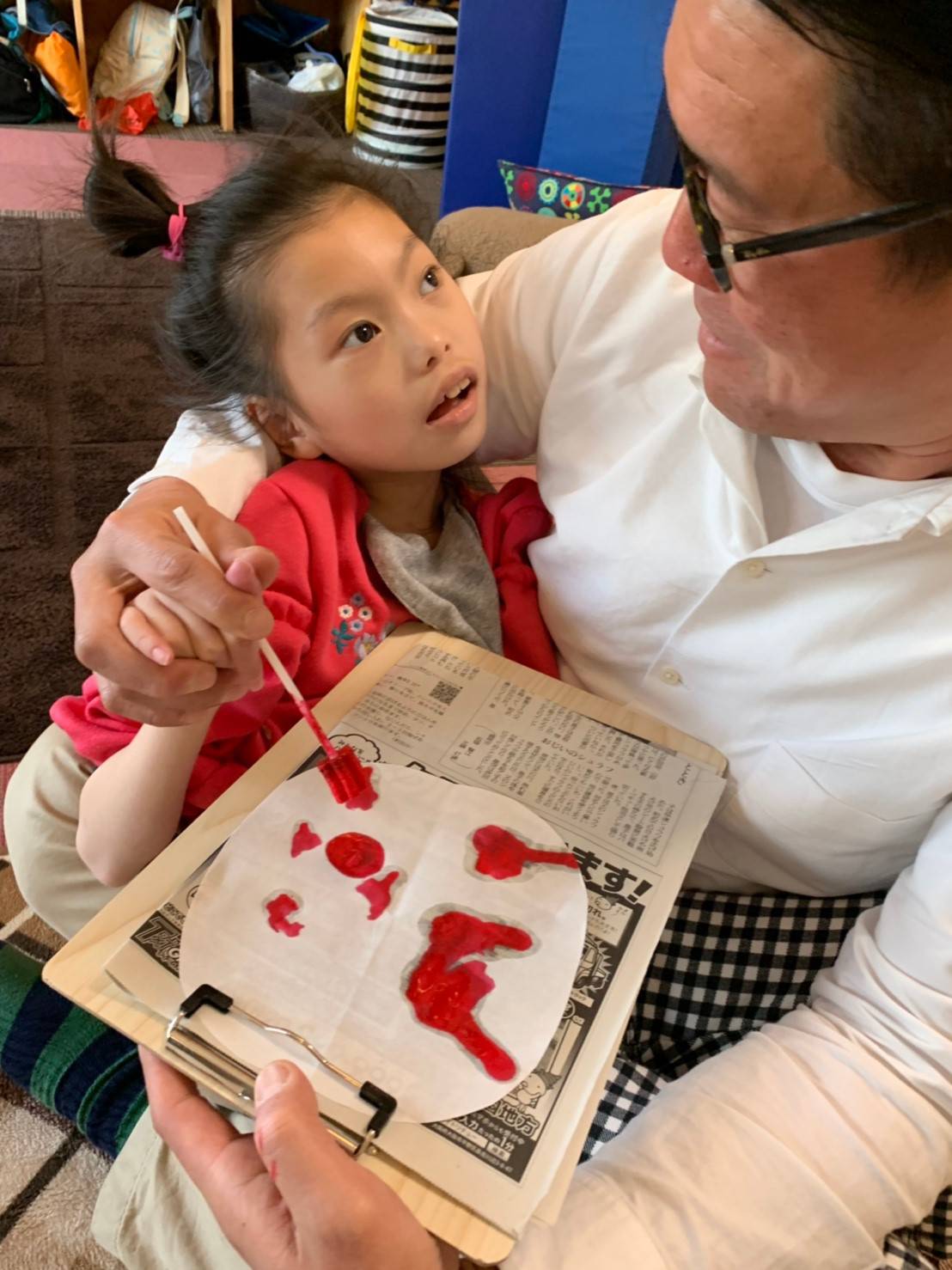 絵具が乾いてからは黒い点や頭を貼り付けて