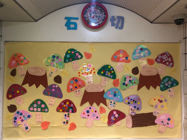みんなで製作した色とりどりのきのこ、長いきのこ、短いきのこなど個性豊かなかわいいきのこ達が