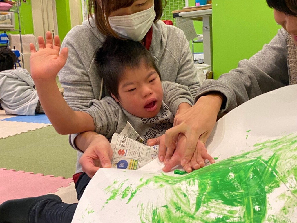 自分の顔よりも大きい画用紙に手や足を大きく動かして
