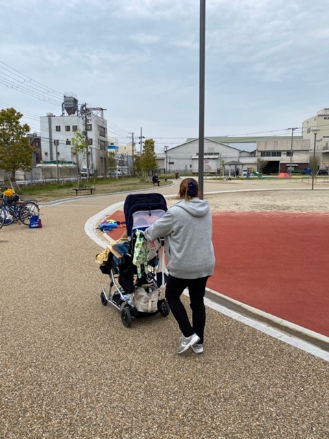 近くの公園に到着して、バギーから降りて車内に敷いた布団の上に“ゴロリンコ”。