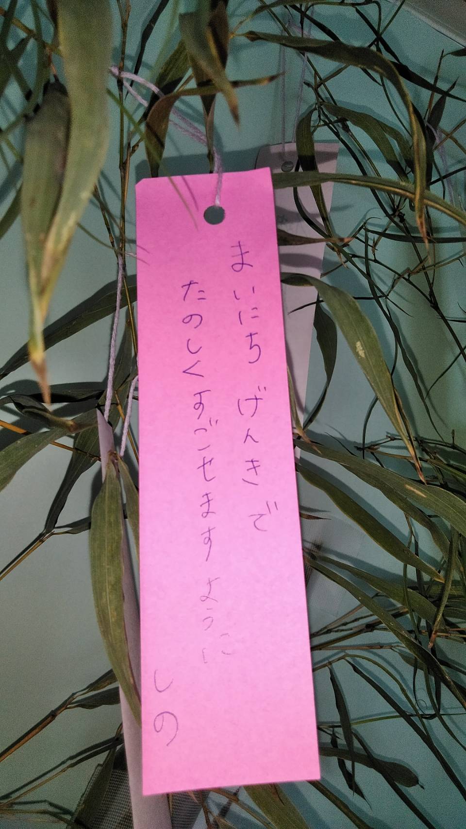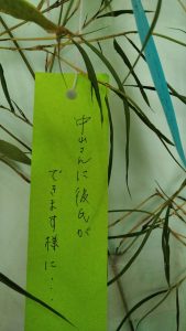 毎年恒例ですが、皆さんに七夕の短冊にお願い事を書いて頂き、