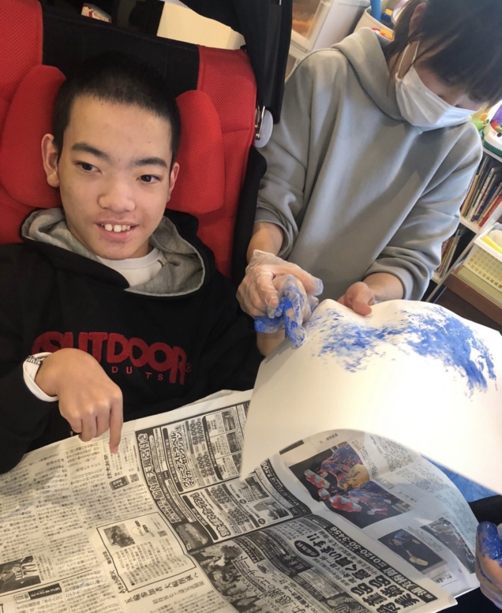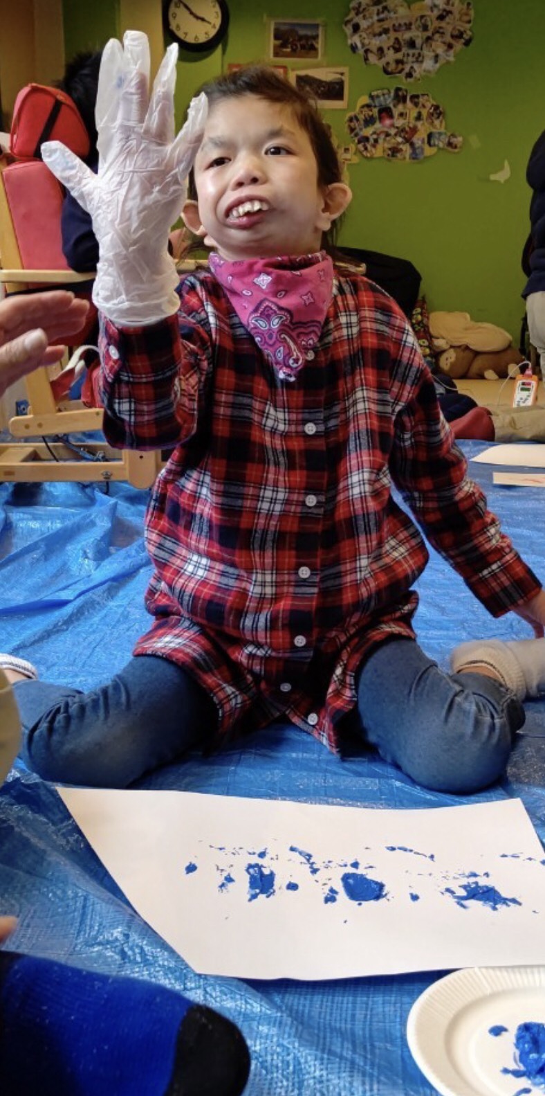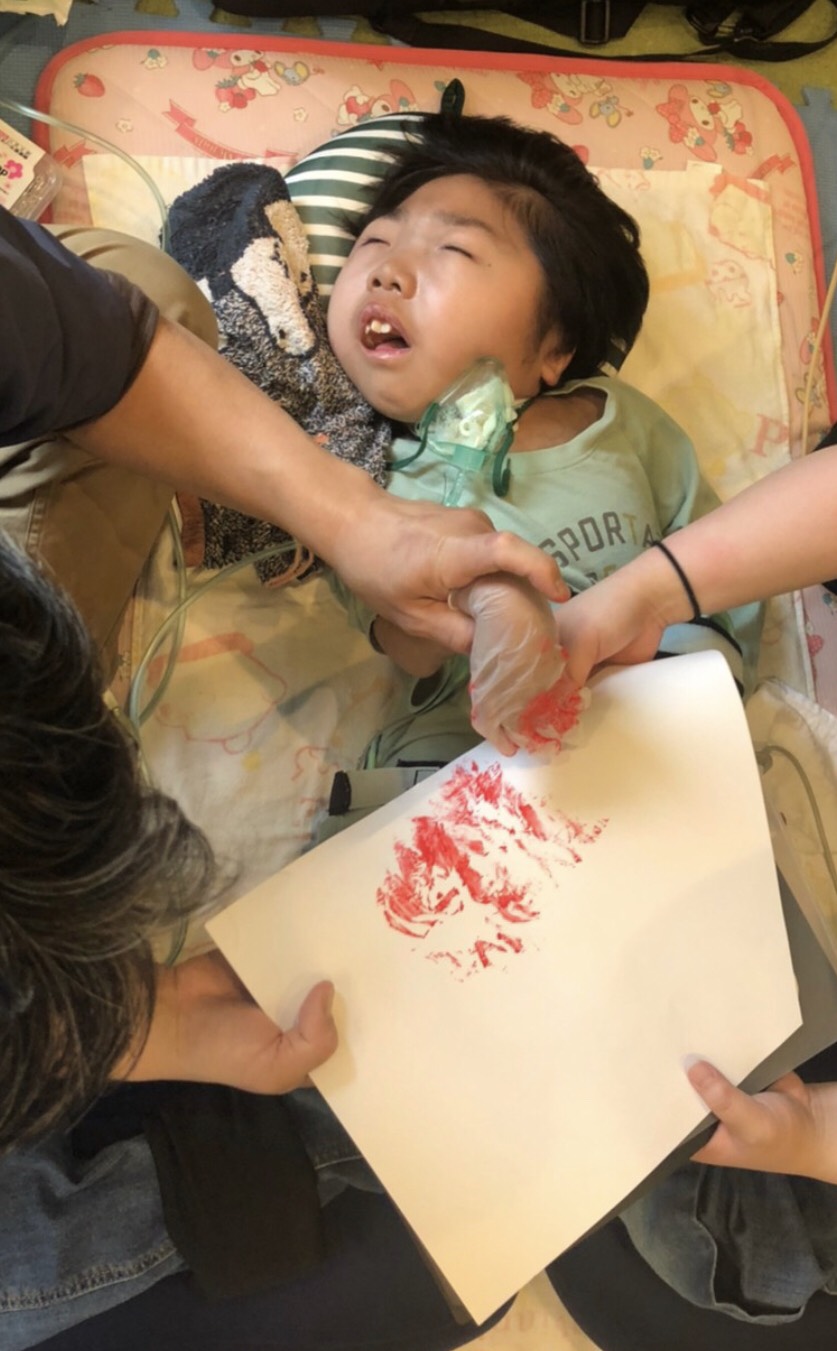 今回は手袋を付けて絵の具に触れました。