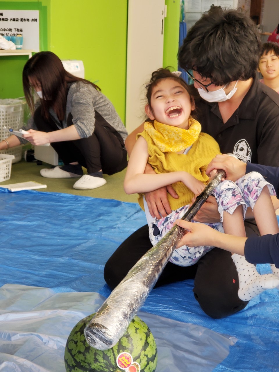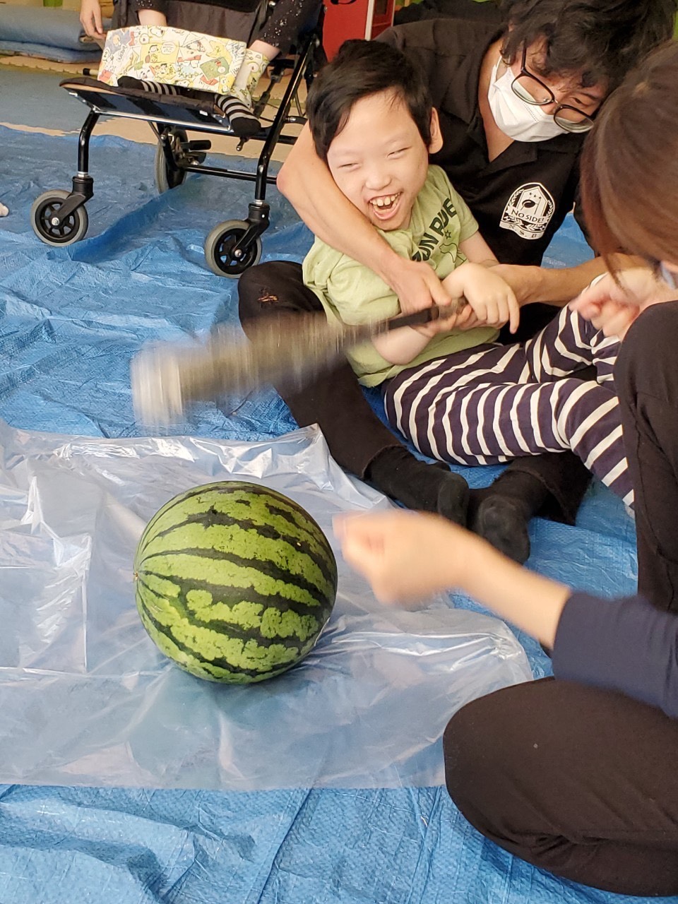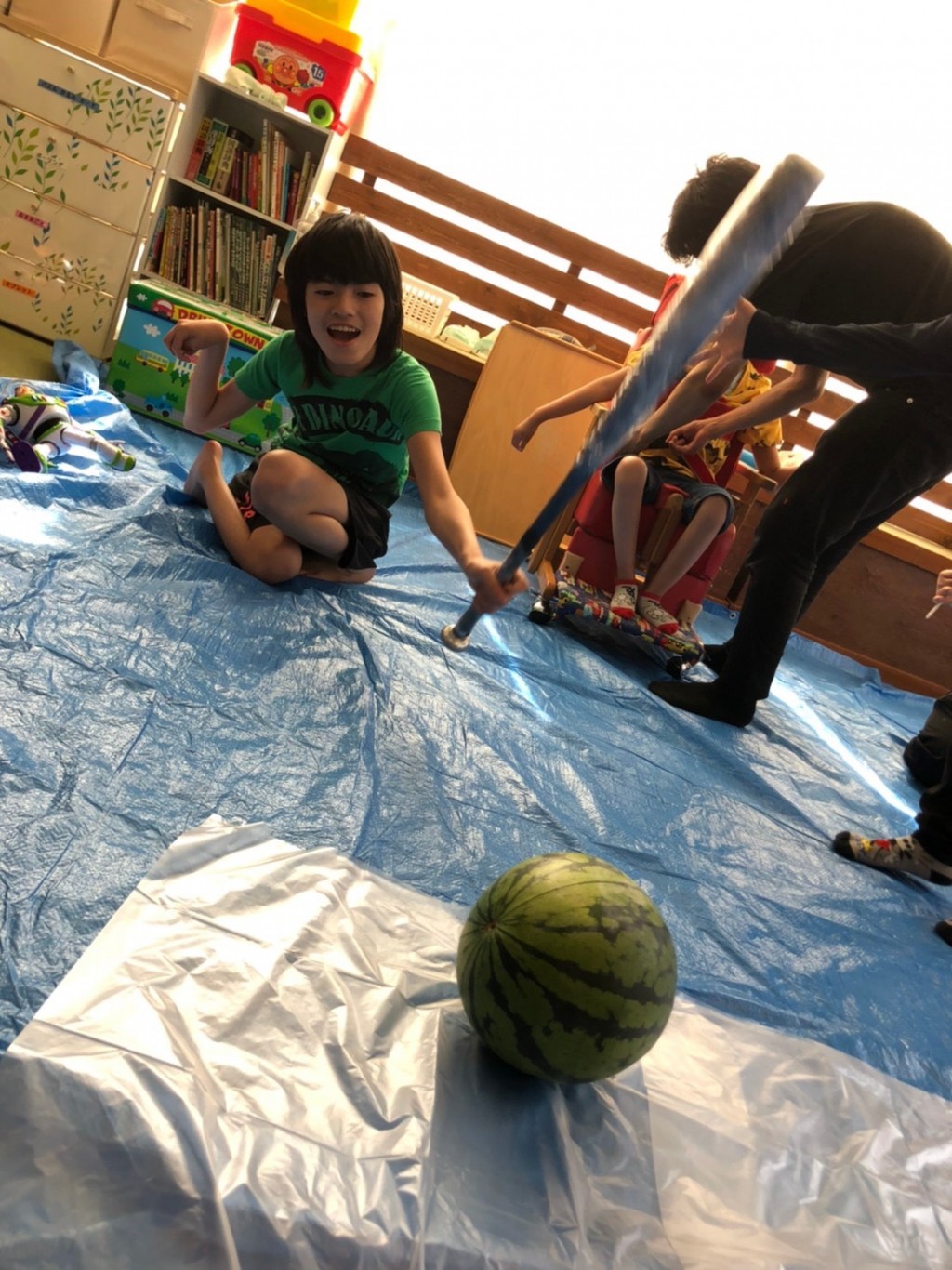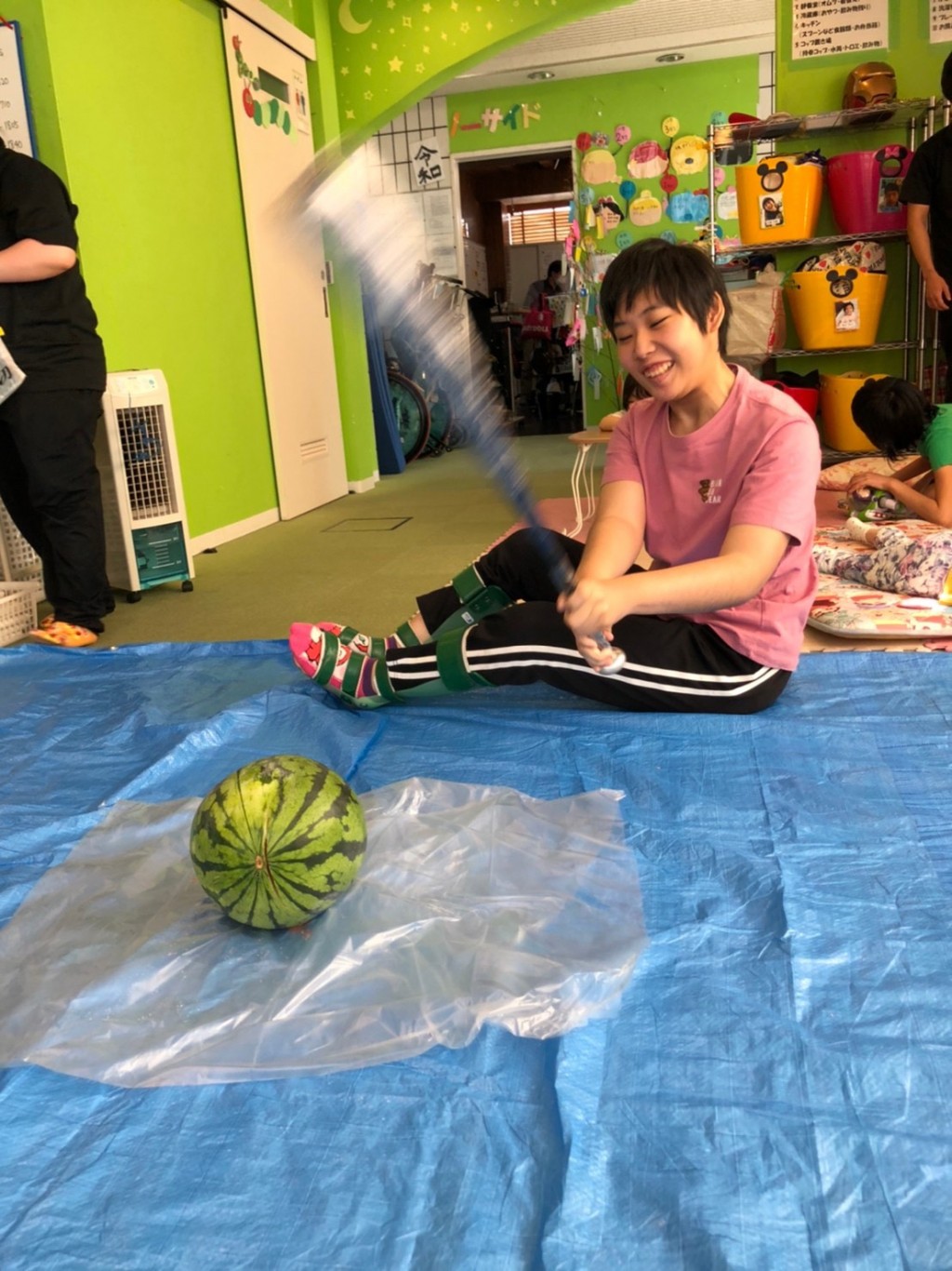 みんなで「よいしょー‼︎」と言いながら、重たいバットをしっかり持って、スイカ目掛けて一生懸命叩きました‼︎
