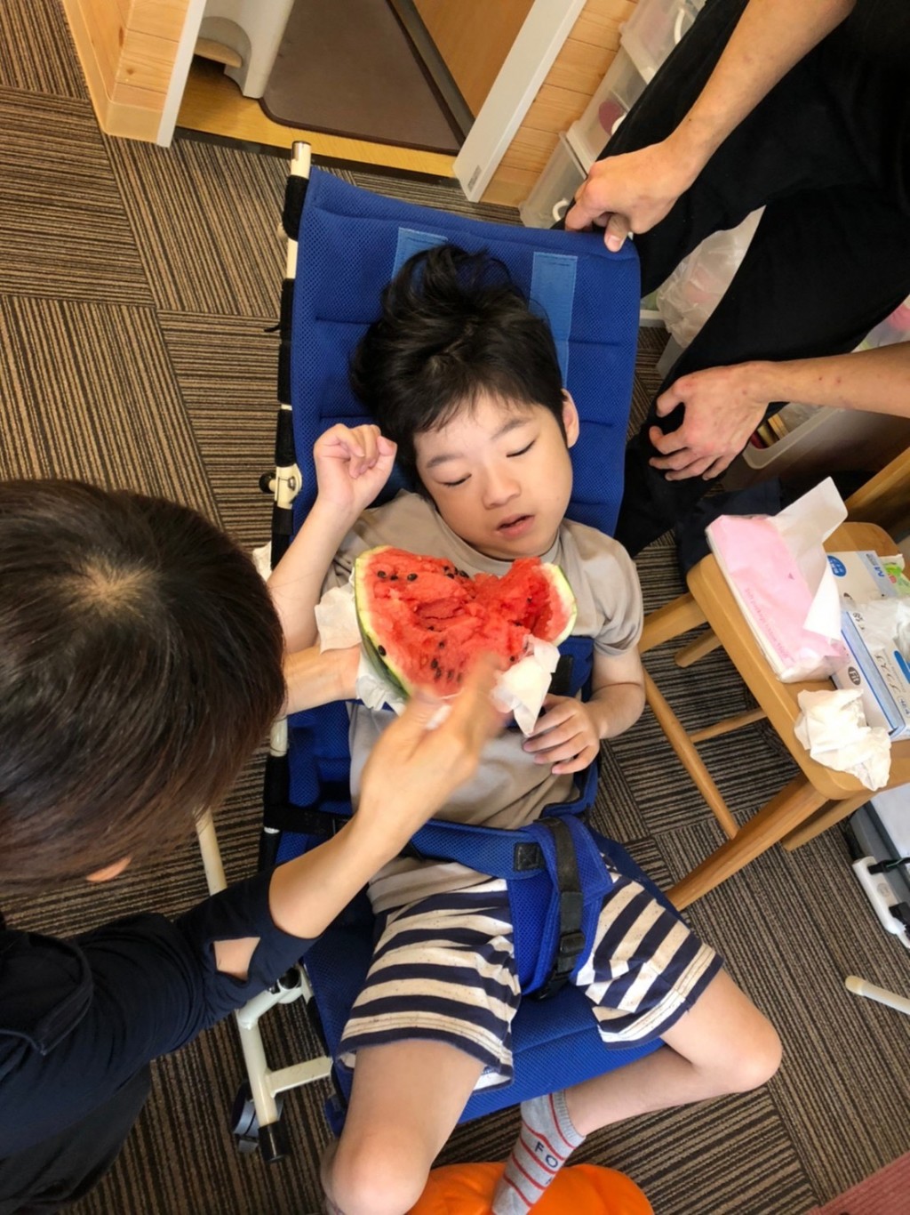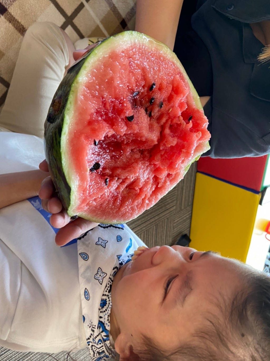 割ったスイカの匂いをかいでもらい、不思議そうな顔をする子や「美味しそう〜‼︎」と顔がうっとりする子(^_^)