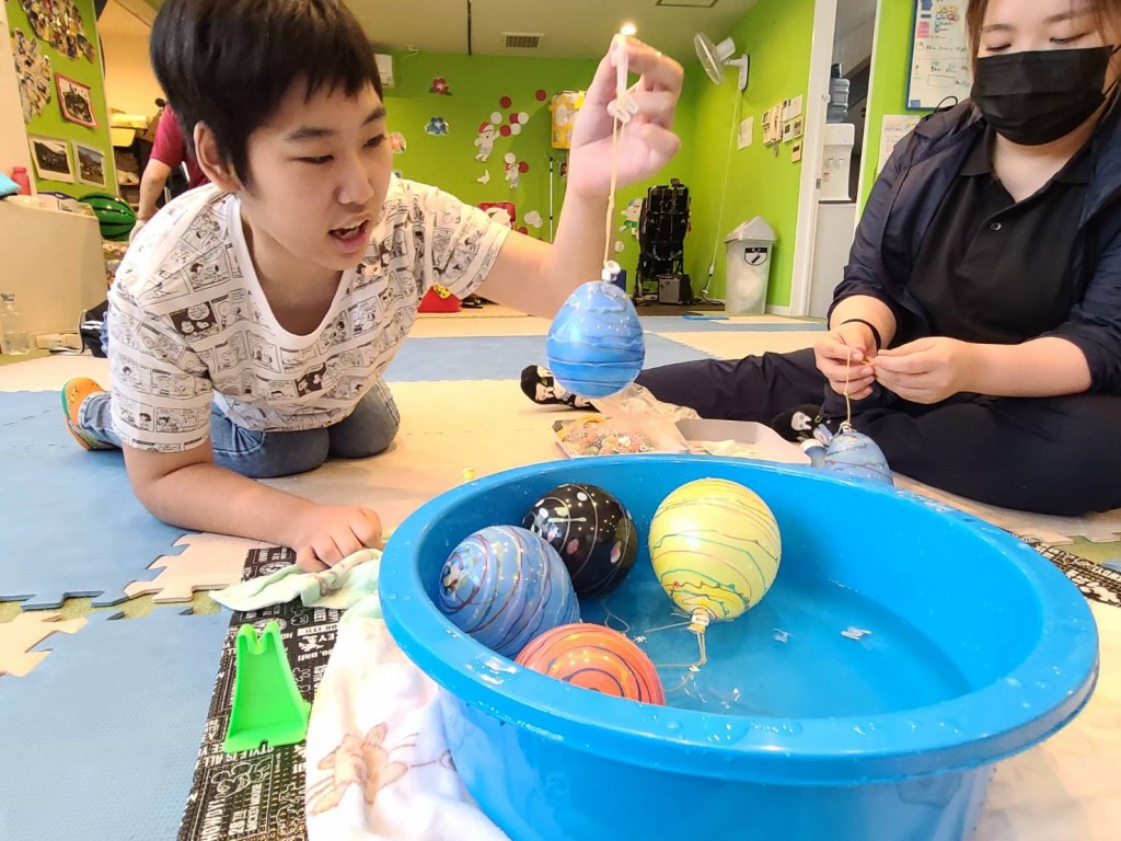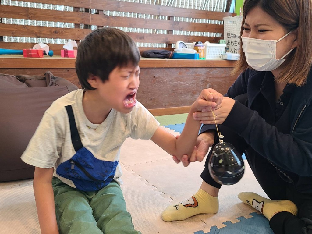 色とりどりのヨーヨー風船がとってもきれい!子どもたちとスタッフが協力して挑戦しますが、みんな、なかなかうまく釣ることができません。あらあら、悔しくて泣いちゃった😢