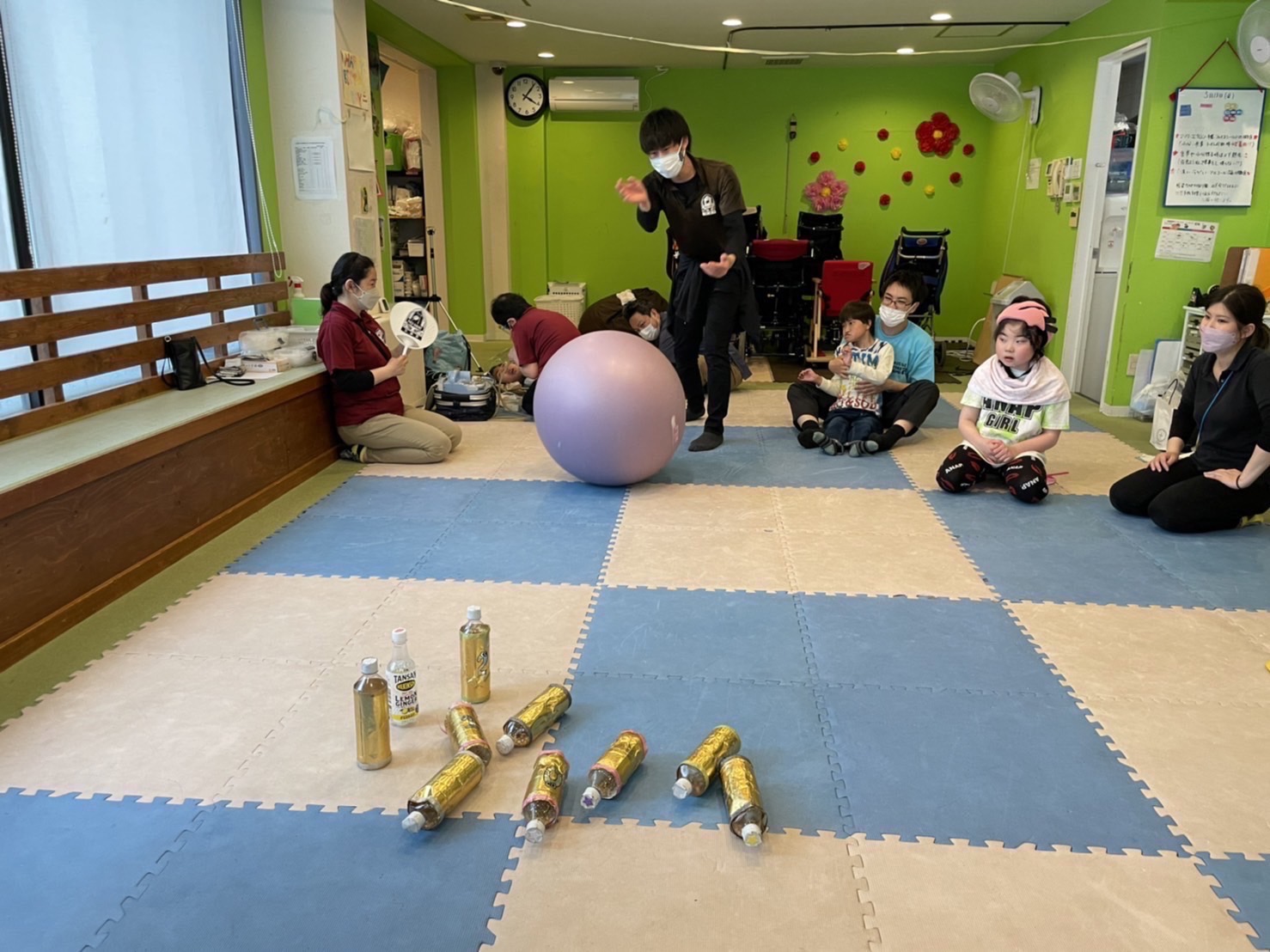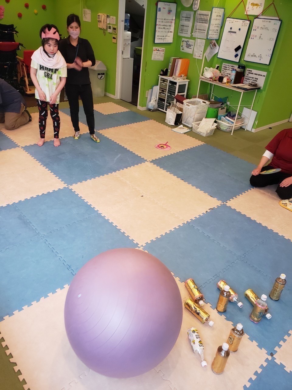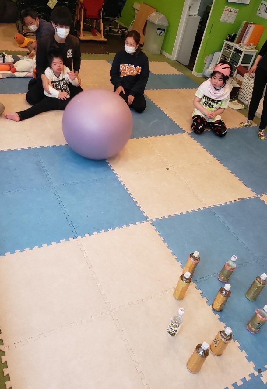 ペットボトルのピンに向かって投げます!