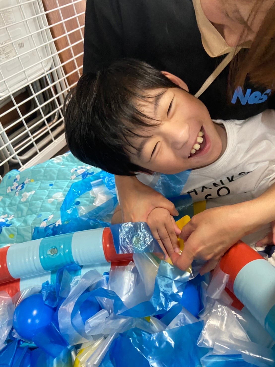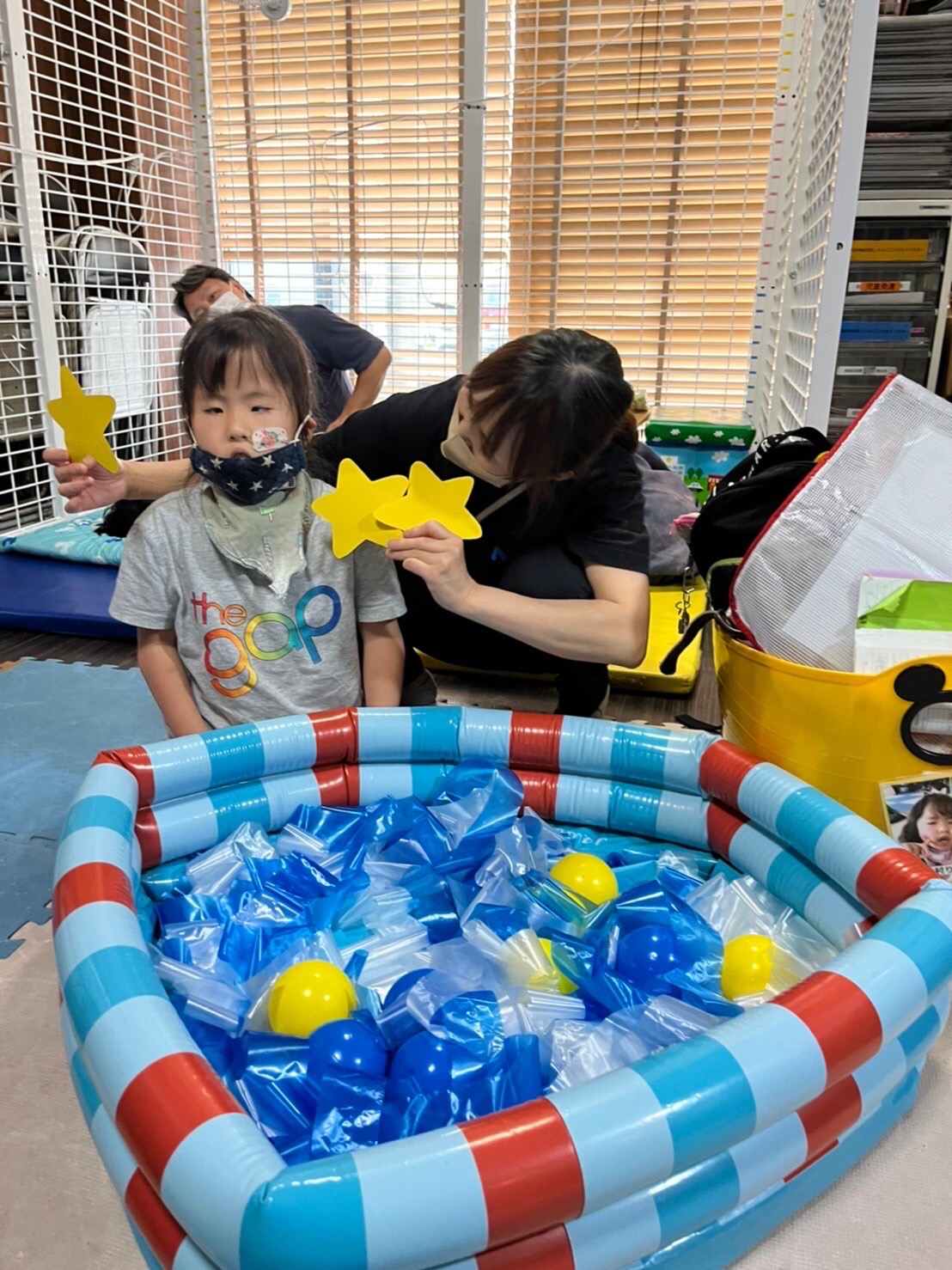 ビニールプールに青と白のスズランテープをいっぱい入れてその中に星を隠しました!制限時間30秒でどれだけ取れるかというゲームです!
