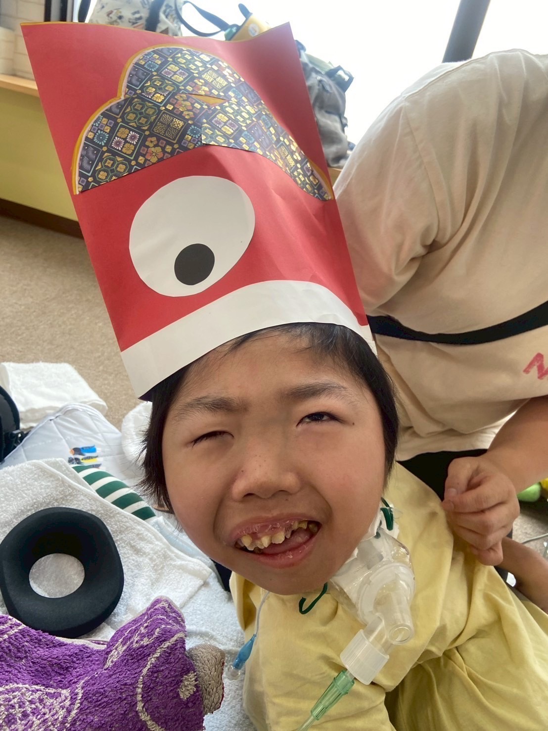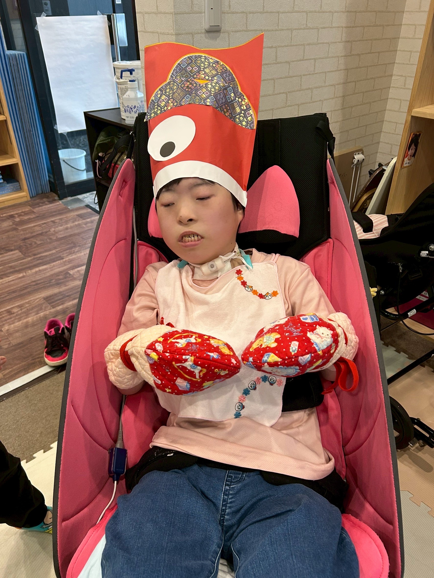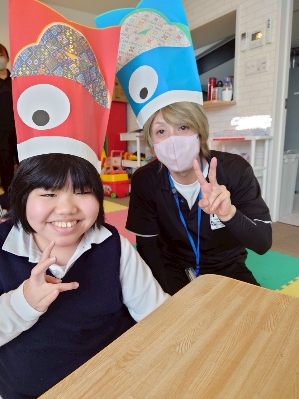 今回は、5月5日のこどもの日が近づいてきたので、デイで鯉のぼりの帽子を作り、みんなが被っている写真を撮りました!📸