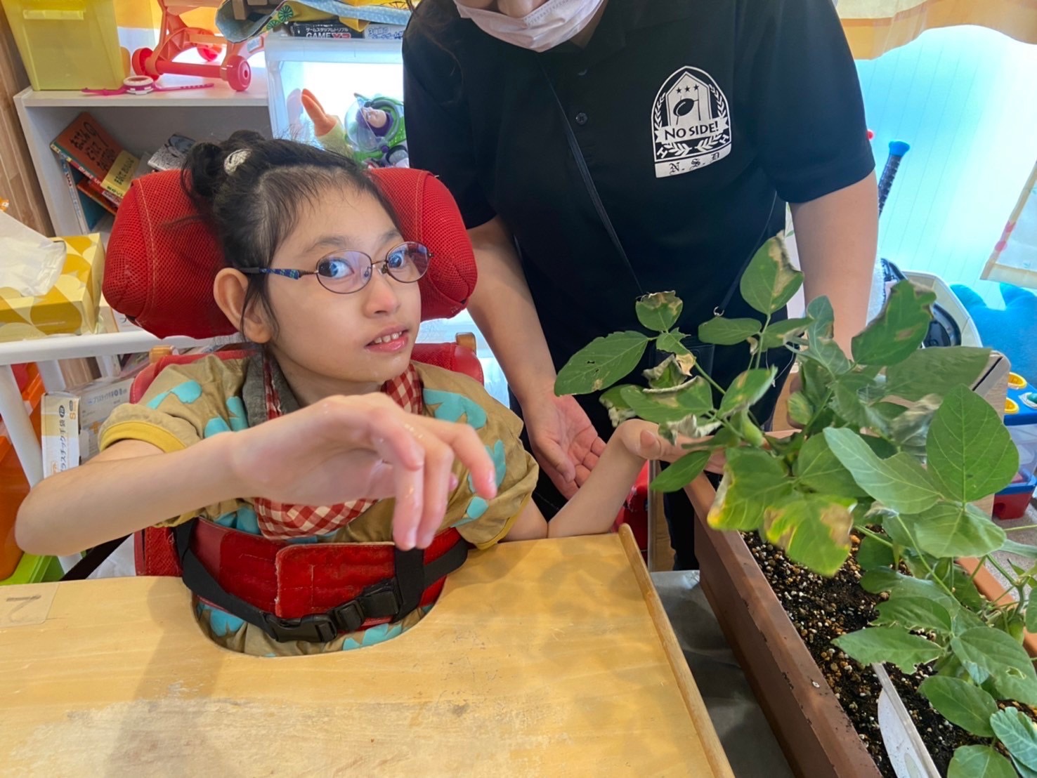 さて、今月のGOKANプログラムでは エントランス横にちょこっとあるノーサイドファームの枝豆とプチトマトの収穫をしました(≧∀≦)