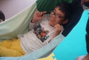 笑い声につられてシーツブランコの横に