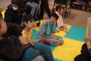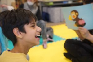 読み手のスタッフの問いかけに子どもたちはお互いの顔を見合わせます👀