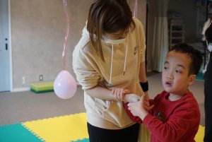 カラフルな風船たちが、エアコンの風にのってゆらゆらと揺れる中、それぞれに合う高さの風船を打って楽しむ時間は笑顔あふれる素敵な時間でもあります(#^^#)
