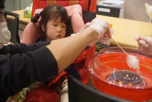 わたあめ作り初挑戦のお友だち、わたあめが出来ていく様子をドキドキしながら見つめます👀